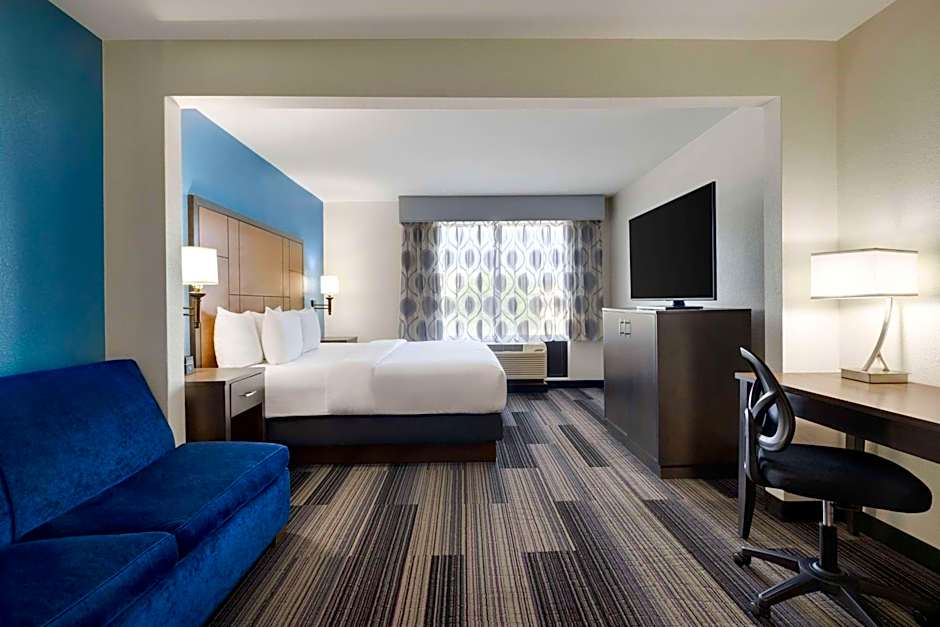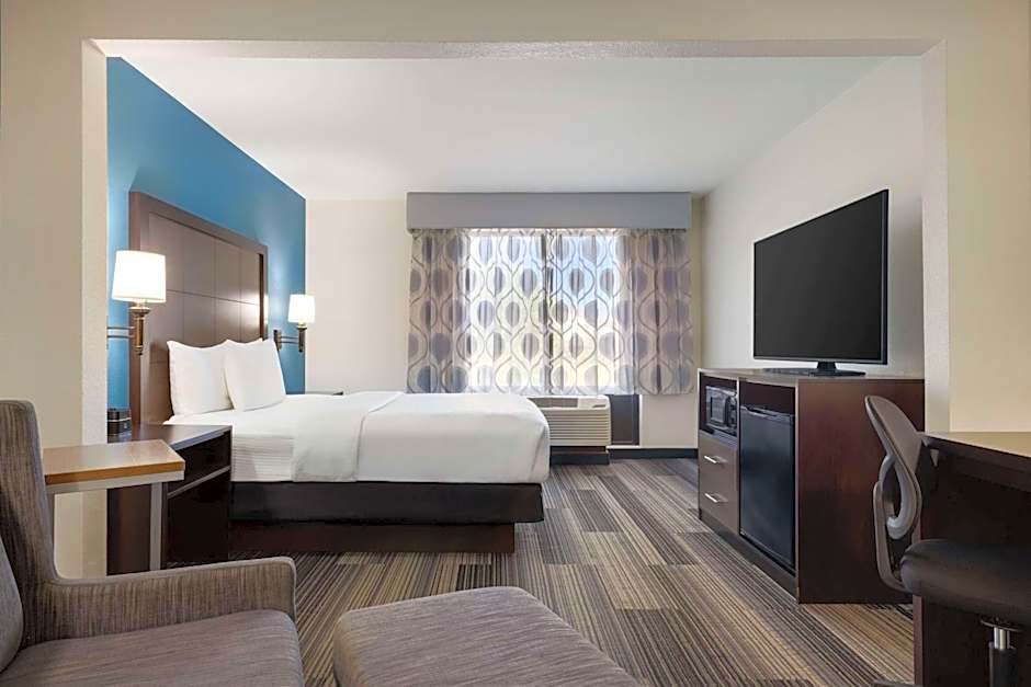 Featuring a 37-inch flat-screen TV, this room also offers a microwave and fridge.